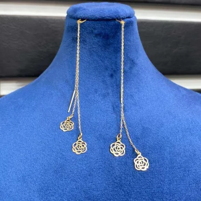 - گوشواره طلا آویز زنجیری دخترانه: شامل گوشوارههایی با زنجیر طلا نازک یا چندلایه که به صورت نرم و روان از گوش آویزان میشوند. این طراحی خاص، حس حرکت و سبکی را به استایل شما میدهد و بهویژه در ترکیب با مدل موهای جمع، جلوهای خاص دارد.
